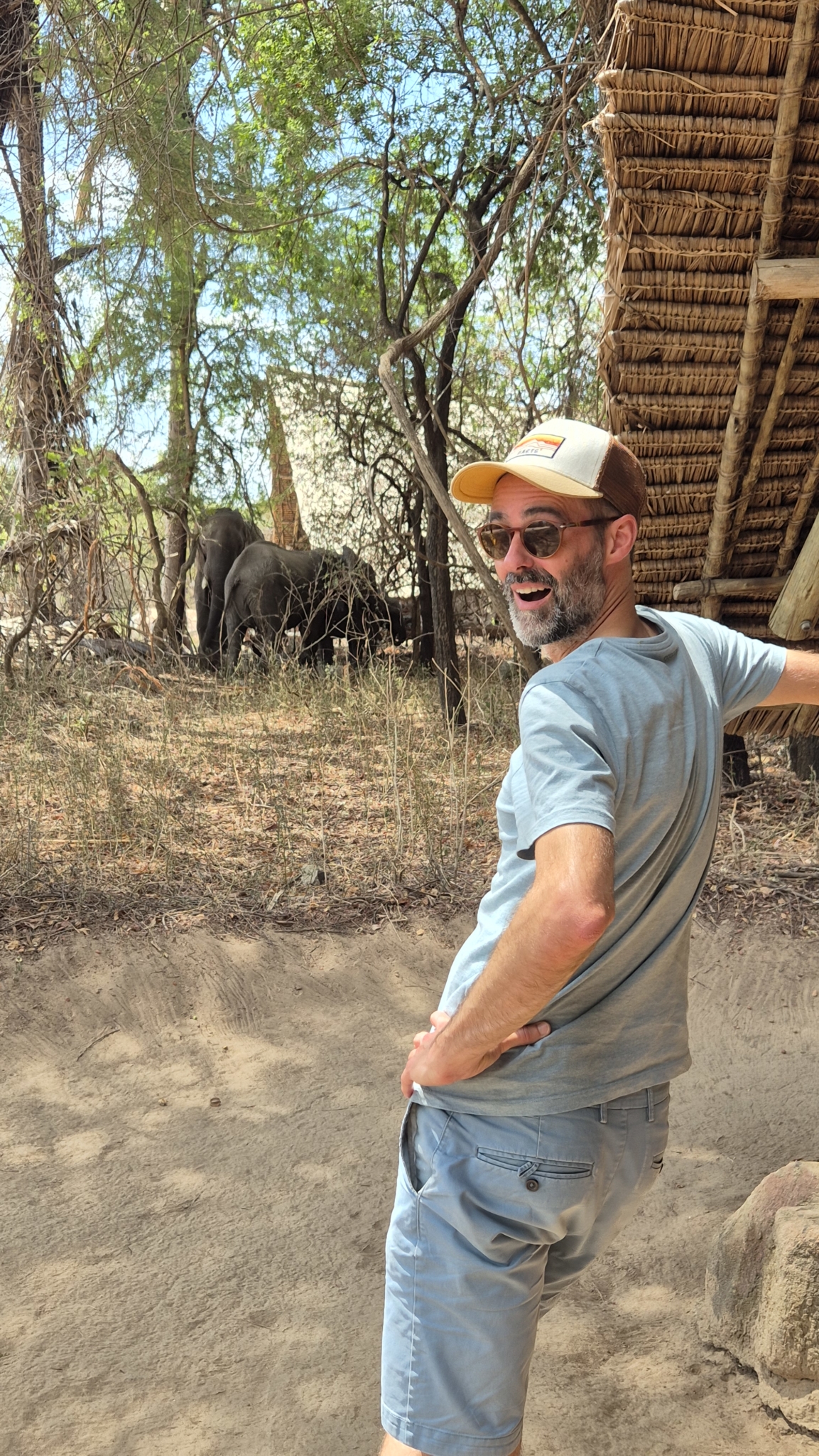 Cap maintenant vers le parc de Ruaha, que l’on rejoint par un vol d’1h30 environ à bord d’un petit Cessna identique à celui de l’aller. On gagne quelques degrés, les paysages semblent un peu plus ouverts qu’à Nyerere. Ici, pas de lacs, mais des rivières, dont la Ruaha qui file jusqu’à Nyerere puis l’océan indien. Bien entendu, les lodges sont plantés sur leurs rives, théâtre de l’animation animalière… et pour preuve, dès notre arrivée, de l’autre côté de la rivière asséchée, un troupeau d’éléphants se planque à l’ombre des acacias, attendant un répit de l’astre solaire pour activer leur marche. Cocktail à la mangue face à cette scène réjouissante, qui ne sera pas la seule : pendant nos 2 jours au lodge, il nous aura fallu toute vigilance pour ne pas se faire piétiner par ces pachydermes venus se rassasier autour de notre tente. Le guide masaï veillait, bien sûr, mais la rencontre nez à nez avec de tels mastodontes, et surtout les dizaines de minutes à les observer de très près depuis le deck de notre habitation, nous laisseront un sacré beau souvenir. Si placides, si discrets, et pourtant si imposants…